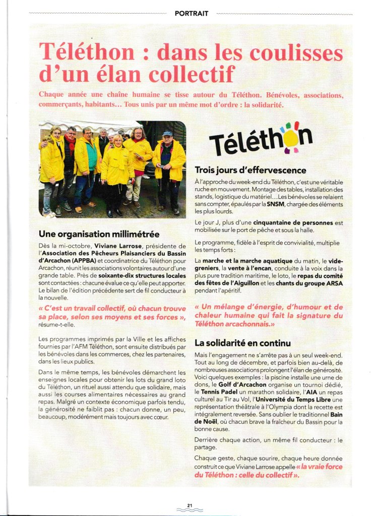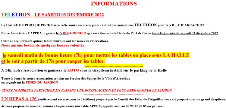 L’ APPBA participera encore cette année à l’organisation et l’animation du TELETHON 2025. Venez nombreux le samedi 6 décembre sous la Halle du port de pêche et participez aux nombreuses activités qui vous sont proposées !
