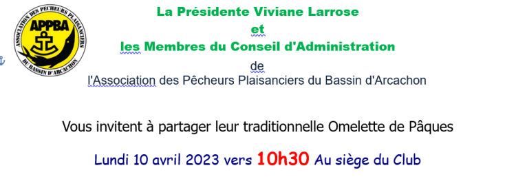 Pour rappel, RDV des adhérents volontaires de l’APPBA samedi prochain 30 avril sur le fronton de mer d’Arcachon pour l’ouverture des huitres !