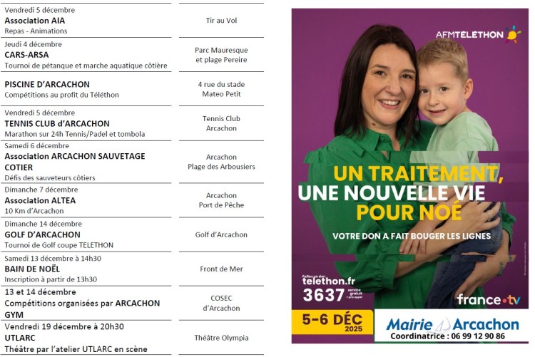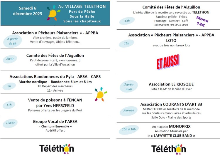 Voir l’ensemble du programme ci dessous ou sur le site de la ville d’Arcachon https://www.ville-arcachon.fr/agenda/39eme-edition-du-telethon/